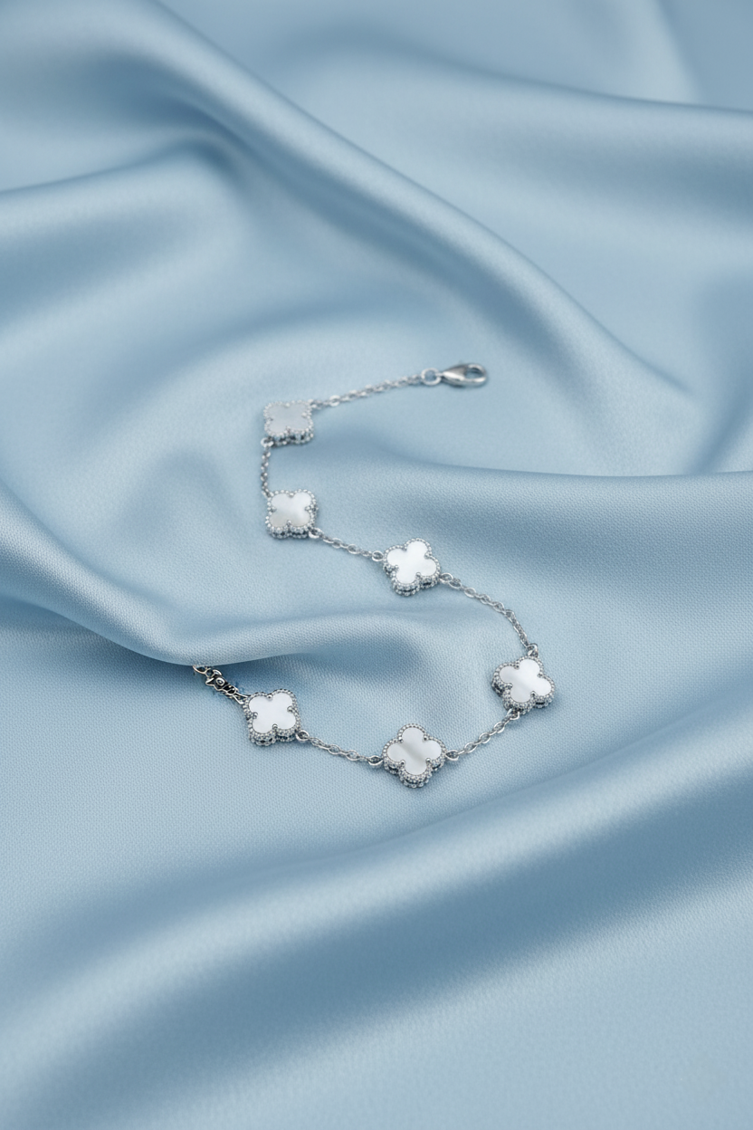 The Design: This 925 sterling silver bracelet features five clover stations, each inlaid with genuine mother of pearl for a soft iridescent shimmer and framed with delicate beaded detailing.