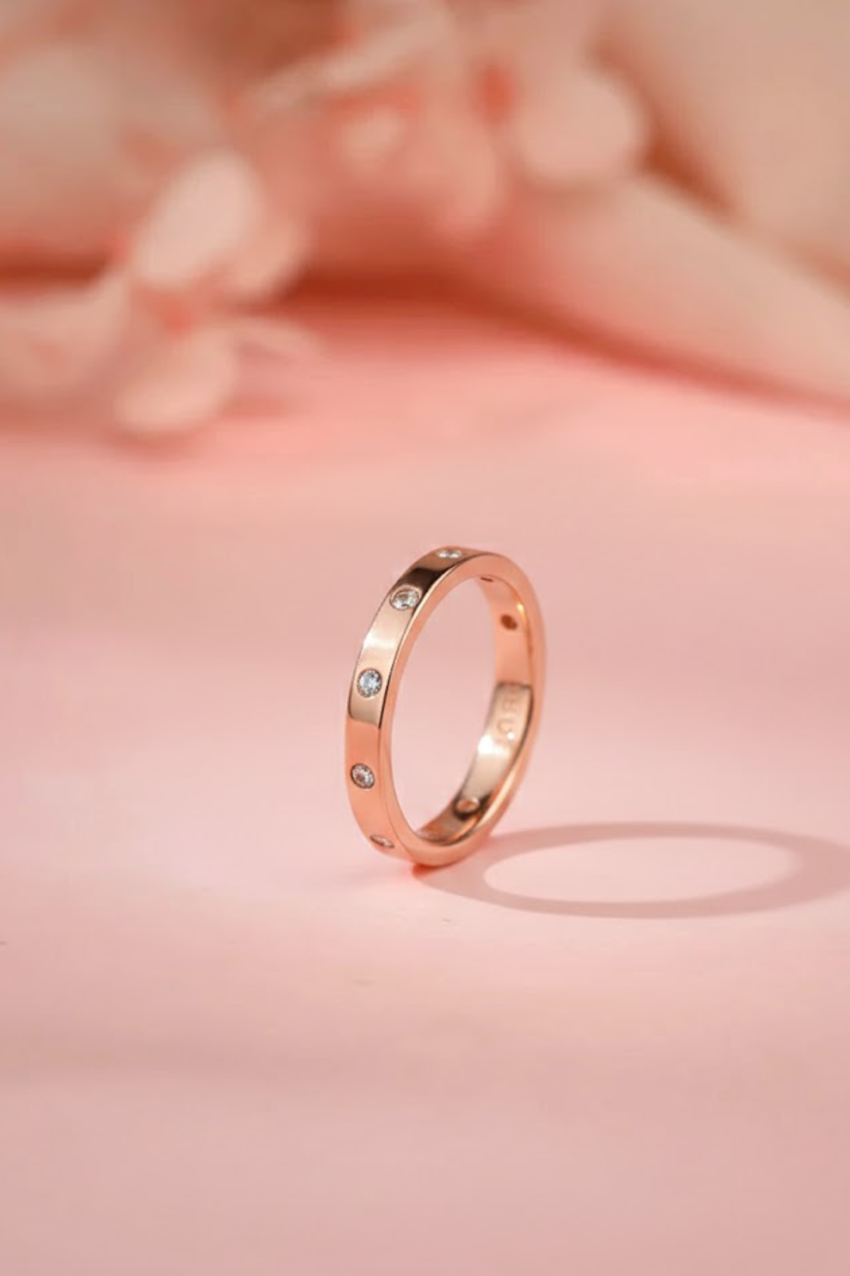 Crafted in pure 925 sterling silver and finished with a rich rose gold polish, the smooth band is punctuated by brilliant round-cut cubic zirconia. The stones are flush-set into the metal, creating a sleek profile that captures the light without catching on fabric. Available in Sizes 7 and 8, it is the perfect balance of warmth and shine.